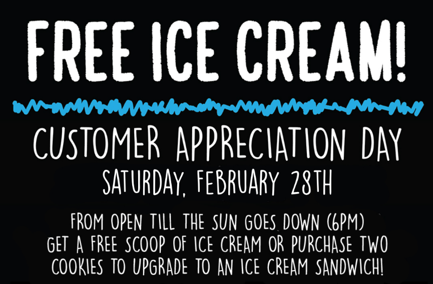 The Baked Bear TX, United StatesFree ice cream! Customer Appreciation Day on Saturday, February 28th from open til the sun goes down (6pm). Get a FREE scoop of ice cream or purchase two cookies to upgrade to an ice cream sandwich!